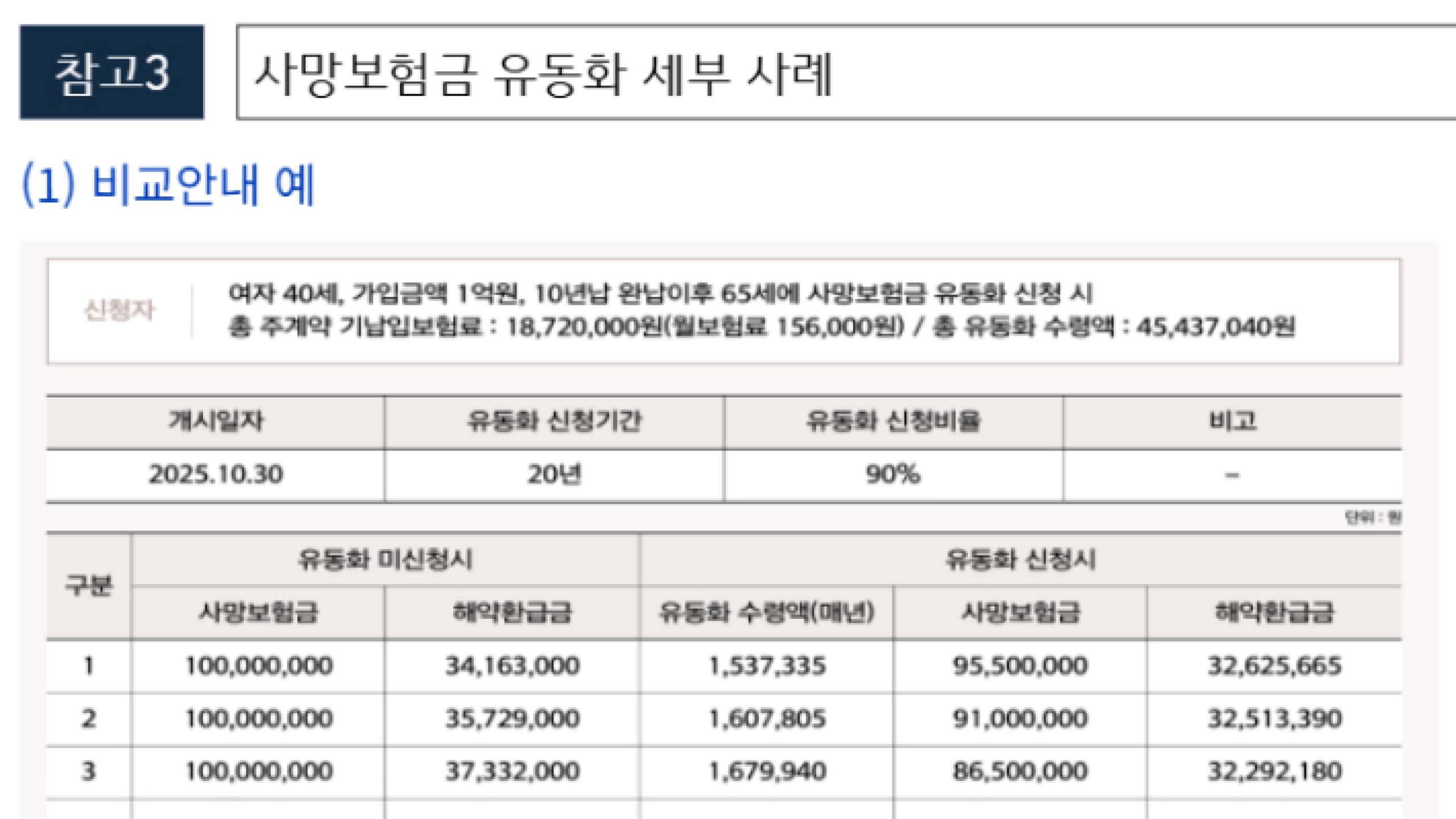 유동화 비율과 지급기간을 감으로 결정하는 것은 위험하다. 이 지점에서 반드시 필요한 것이 보험사로부터 받는 ‘비교결과표’다. 단순히 한 가지 시나리오의 연금액을 듣는 것이 아니라, 여러 선택지를 한눈에 비교할 수 있는 자료를 받아야 한다. 금융위원회도 유동화 신청 전, 시뮬레이션과 비교결과표를 충분히 검토할 것을 공식적으로 안내하고 있다.